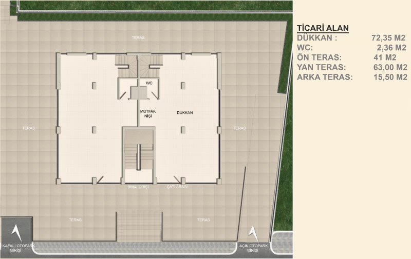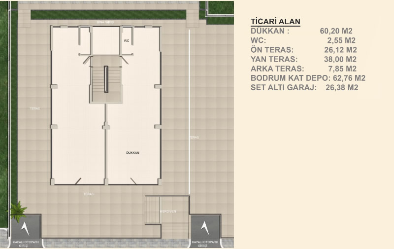 Sosyal Donatılar : çocuk oyun parkı , açık otopark, özel peyzajli bahceler